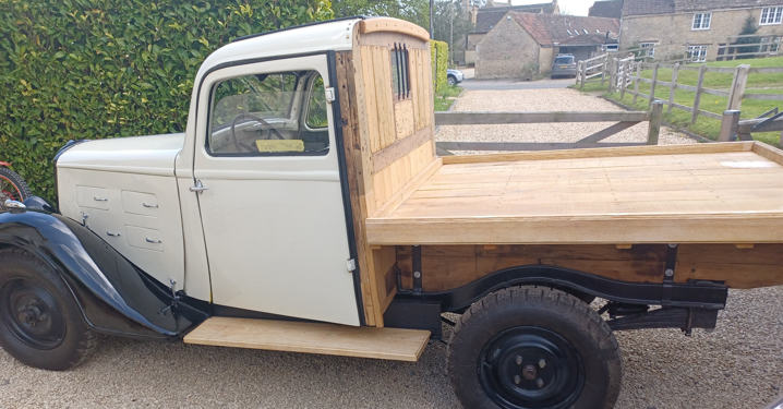 A barn find in 2000 in France. Restored over many years whilst living in France and imported here when moving back to England in 2018 and finally completed and on the road in 2023. It was originally a ‘Boulangère’ van but when found on a farm in the Alsace it had been converted to a farm truck. The truck had laid dormant for an estimated 50 years so a complete rebuild down to the chassis was necessary. The chassis was shot blasted, treated and painted. The engine, suspension, steering, gearbox, brakes etc. were all stripped and rebuilt. The steel cab was largely intact but the wings were refabricated by a local company. The woodwork was mostly rotten and replaced with ash from planked trees. So with help from many friends and local companies here and in France she proves that rust to road is possible. A special mention must be given to the 01 Club in France and the Peugeot Club in France as well as Automobiles Peugeot France, and the DVLA without whose help the official identification, authentication and British registration would not be possible.