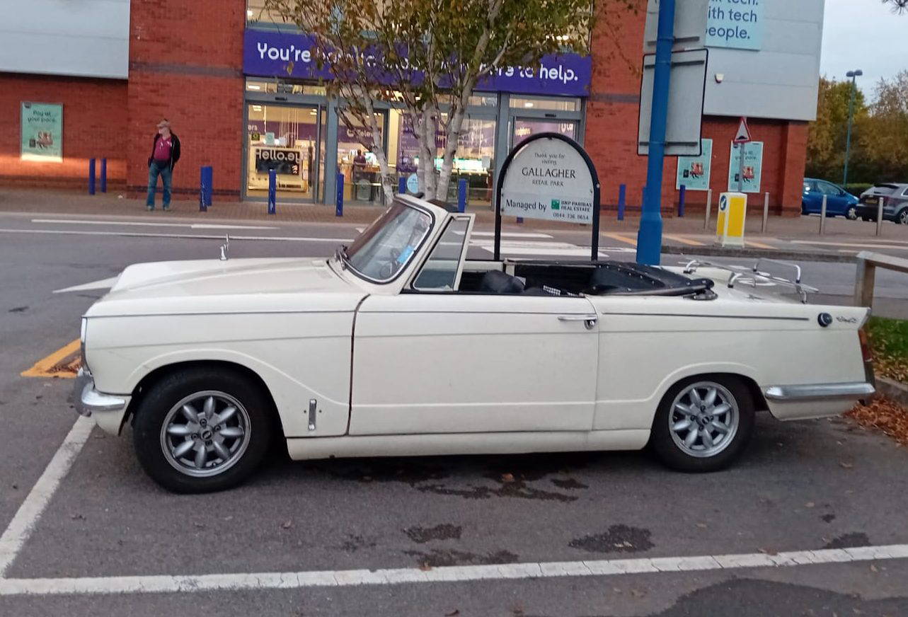 Old English white 1969 triumoh herald convertible no hood called molly